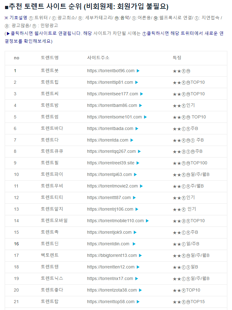 추천 토렌트 사이트 순위를 공유합니다 (ver.2023.7.28) 추천 토렌트 사이트 순위를 선정하여 소개해봅니다. 각 토렌트 사이트들의 장단점을 쉽게 파악하실 수 있도록 특징을 기호의 형태로 기록