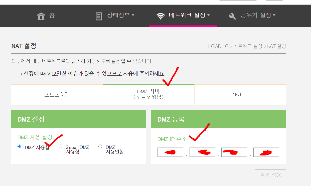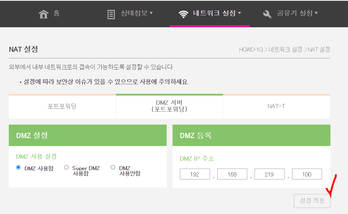 LG U플러스 공유기 - DMZ IP 주소에 : 192.168.219.100 입력함