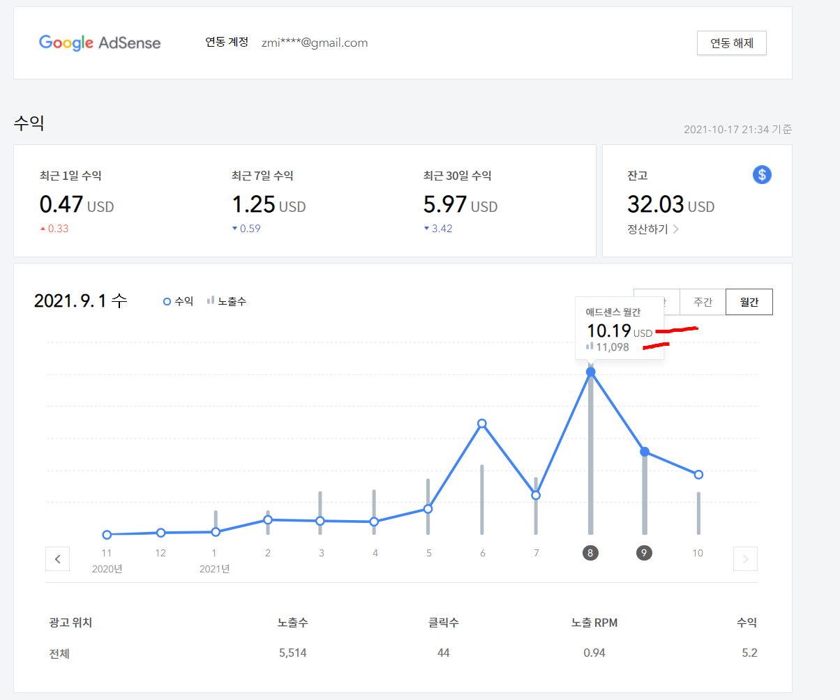 21년 9월의 경우 조회수 5,514 / 5.2USD (약 6천원)