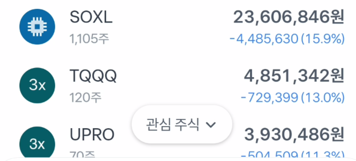 야수의 심잠을 가져야 투자를 할 수 있다는 미국 3배 레버리지 주식들을 장기간 유지(2년)하면서 50% 수익 달성시 전량 매도하겠다는 다짐을 하면서 주식을 모으기 시작했다 내가 모으는 주식은 S